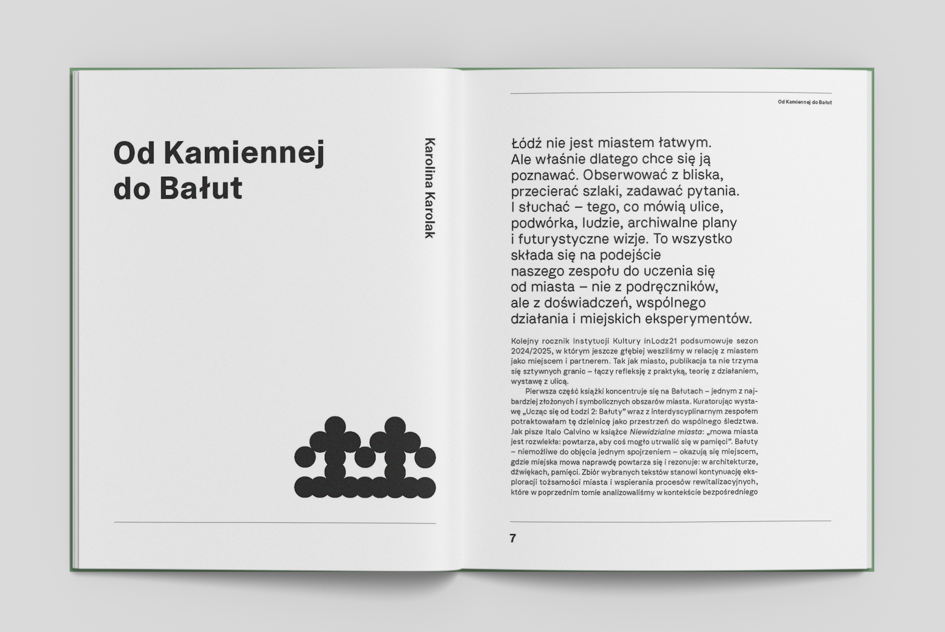 Pierwsza część książki koncentruje się na Bałutach – jednym z najbardziej złożonych i symbolicznych obszarów miasta. Kuratorując wystawę „Ucząc się od Łodzi 2: Bałuty” wraz z interdyscyplinarnym zespołem, potraktowałam tę dzielnicę jako przestrzeń do wspólnego śledztwa. Jak pisze Italo Calvino w książce Niewidzialne miasta: „mowa miasta jest rozwlekła: powtarza, aby coś mogło utrwalić się w pamięci.”